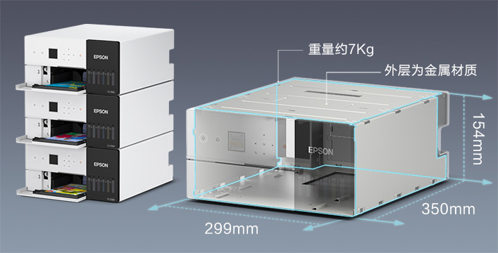 在设计上,爱普生SureLab D580同样展现出了其匠心独运。紧凑小巧的机身设计,占地面积不足0.12平方米,重量仅约7千克*1,无论是摆放在前台、屉柜还是角落,都能轻松融入各种环境,不占空间且美观大方。而其4面钢层结构的坚固设计,更支持多达3台打印机的叠层摆放,大大提高了打印效率与空间利用率。